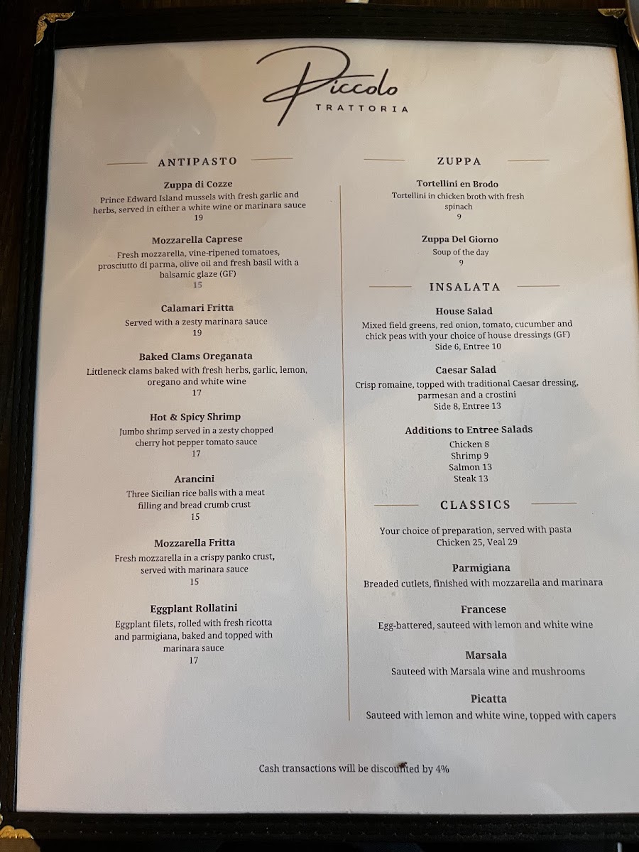 “ We come to Piccolo's at least once a month. I love the fact that specials are always posted on Facebook... I have yet to actually order a meal off the menu myself... there's always an amazing special I want! The arancini balls are our favorite appetizer and the creme Brule is amazing!! The servers are always so sweet and the atmosphere is so nice. Thank you for the birthday song to my wife, tonight! ”