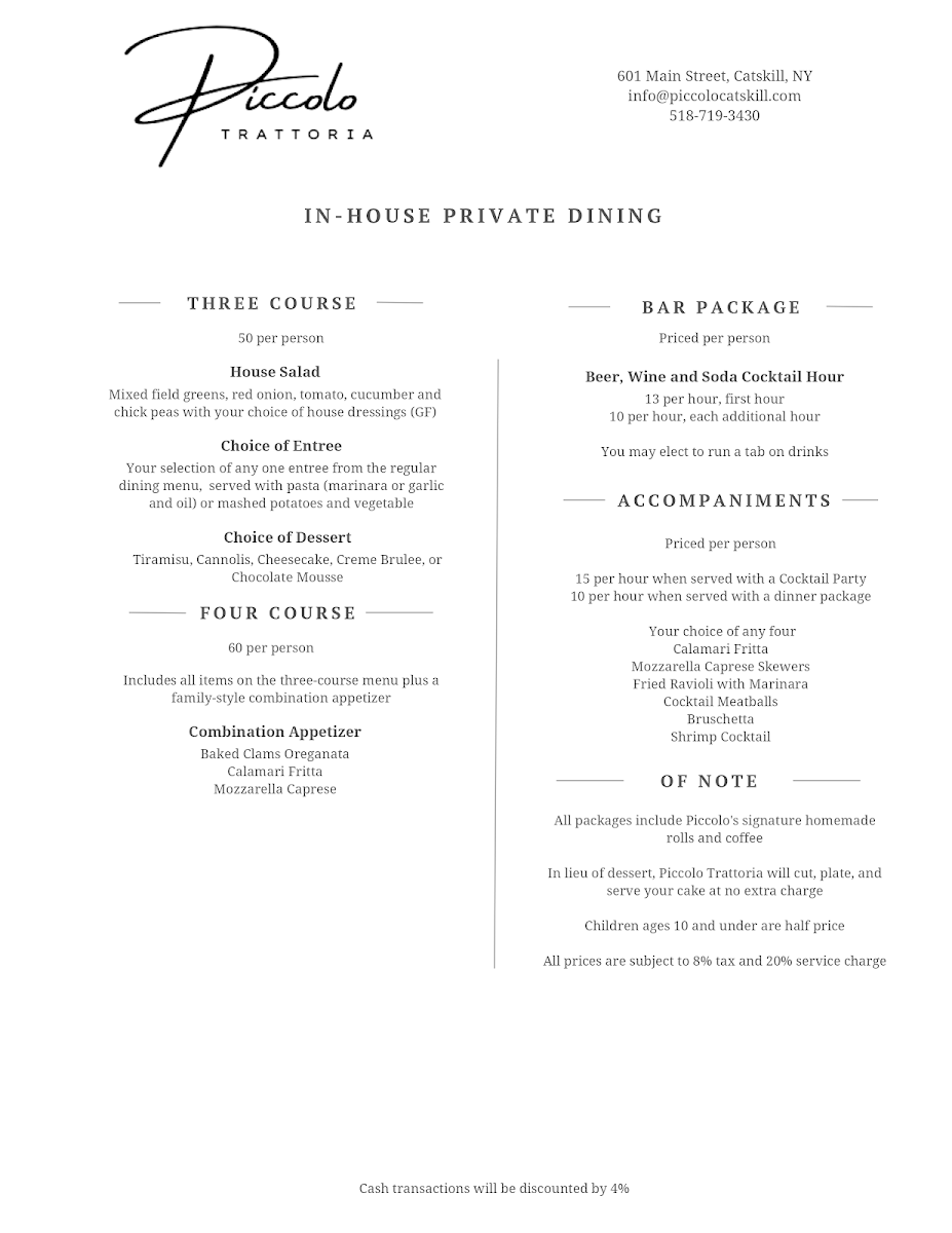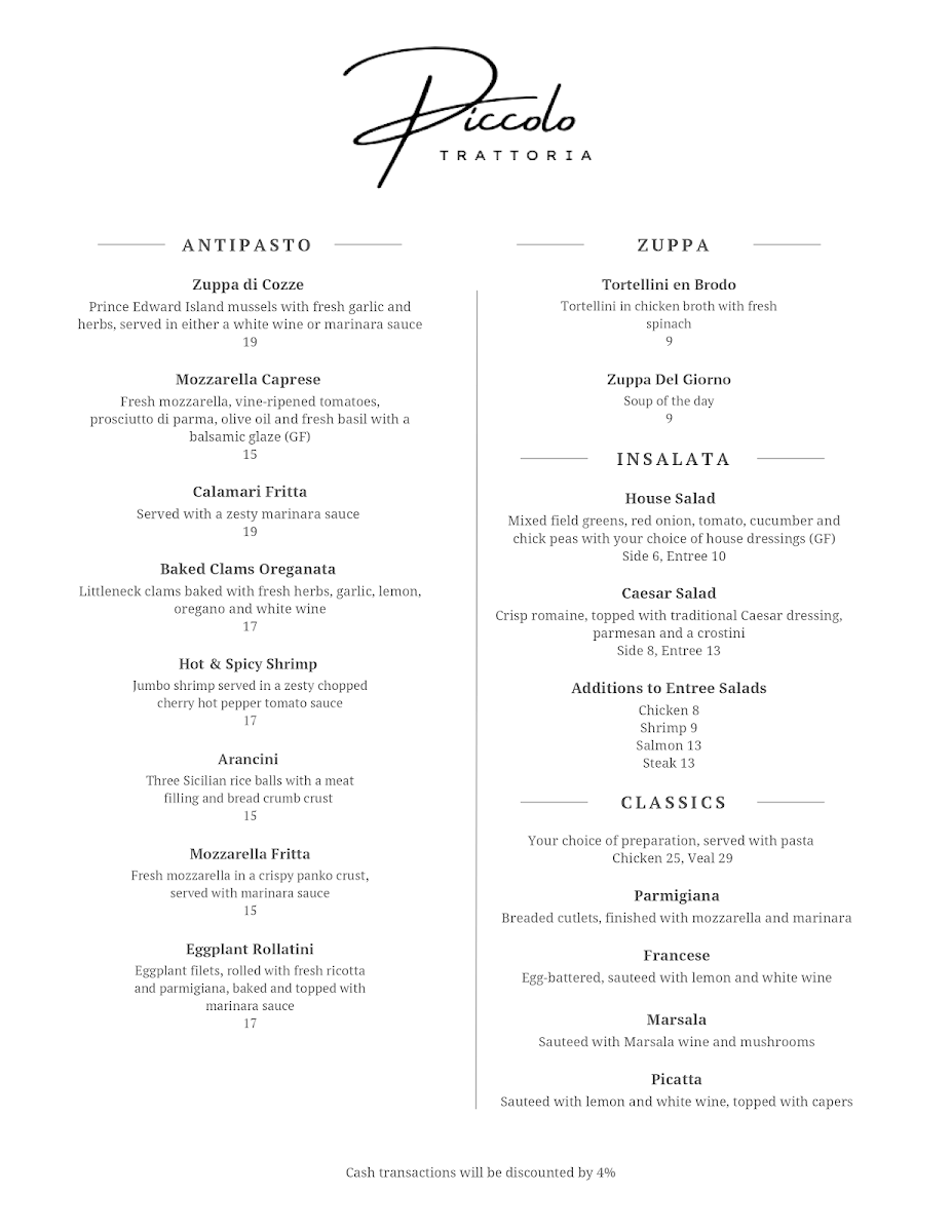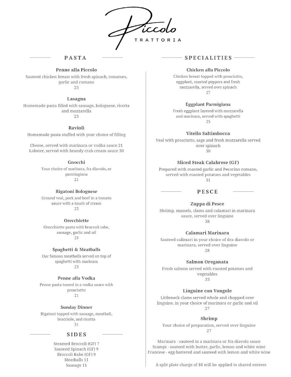 Welcome to Piccolo Trattoria, where authentic Italian cuisine meets the cozy charm of Leeds, NY. Nestled at 1147 Main St, this restaurant captures the essence of Italy with its enticing menu. Guests can indulge in sumptuous seafood like Zuppa Di Pesce or savory Calamari Marinara, while meat lovers will relish the tender Pork Osso Bucco. The sides, from Steamed Broccoli to hearty Meatballs, complement the main dishes beautifully.